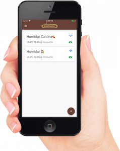 Ti consente di monitorare in tempo reale dal tuo smartphone o tablet lo stato di salute dei tuoi sigari e di ricevere notifiche di variazioni impreviste che potrebbero comprometterne la conservazione e, di conseguenza, gli aromi.